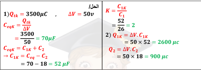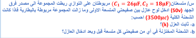 احسب: a -ثابت العزل (k)؟ b -الشحنة المختزنة في أي من صفيحتي كل متسعة قبل وبعد ادخال العازل؟