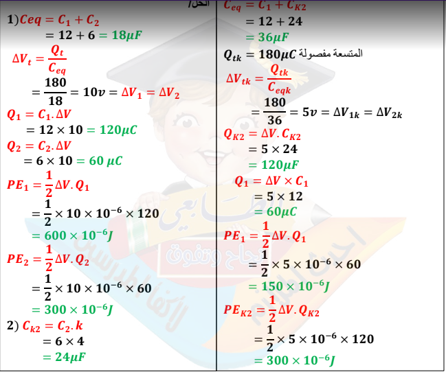 b -ادخل لوح من ماده عازلة ثابت عزله (4 (بين صفيحتي المتسعة الثانية فما مقدار الشحنة المختزنة في أي من صفيحتي كل متسعة وفرق جهد والطاقة المختزنة بين صفيحتي كل متسعة بعد ادخال العازل؟