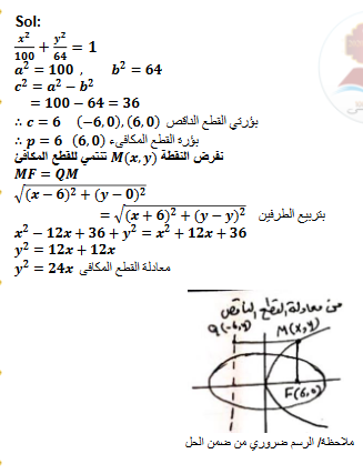 س/جد معادلة القطع المكافىء بطريقة التعريف إذا كانت بؤرته هي البؤرة اليمنى للقطع الناقص x^2/100+y^2/64=1