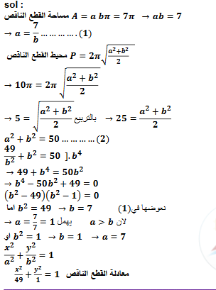 س/جد معادلة القطع الناقص الذي بؤرتاه تنتميان لمحور السينات ومركزة نقطة الاصل ومساحة منطقته𝟕𝝅وحدة مربعة ومحيطه يساوي𝟏𝟎𝝅وحد