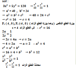 س/جد معادلة القطع الزائد الذي بؤرتاهتنطبقان علىبؤرتي القطع الناقص𝟑𝒙𝟐 + 𝟓𝒚𝟐 = 𝟏𝟐𝟎والنسبة بين طول محوره الحقيقي والبعد بين بؤرتيه كنسبة 𝟏 𝟐