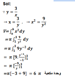 س/جد الحجم الناشىء من دوران المساحة المحصورة بين محور الصادات ومنحني الدالة𝐲 = 𝟑/𝐱حيث𝟏 ≤ 𝒚 ≤ 𝟑 دورة كاملة حول محور الصادات