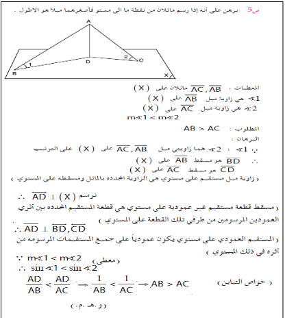 س5/برهن على انه اذا رسم مائلان من نقطة ما إلى مستو فاصغرهما ميلا ً هو الأطول